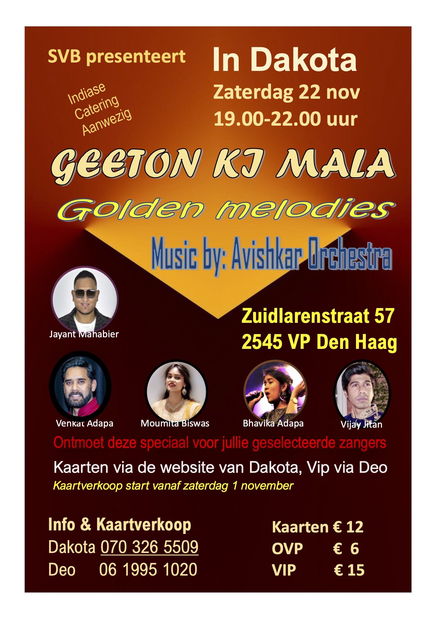 Laat je meevoeren op een muzikale reis vol tijdloze Bollywood-klassiekers. Ervaar de warmte, emotie en energie van de gouden melodieën uit vervlogen tijden. Met prachtige zang van Bhavika Adapa, Moumita Biswas, Vijay Jitan, Jayant Mahabier, en Venkat Adapa, begeleid door het veelzijdige Avishkar Orchestra. Een avond vol muziek, herinneringen en magie – MIS DIT NIET-!! Trouwens er is ook Indiase catering aanwezig, maak er een feestje van. Zie je zaterdag 22 november.