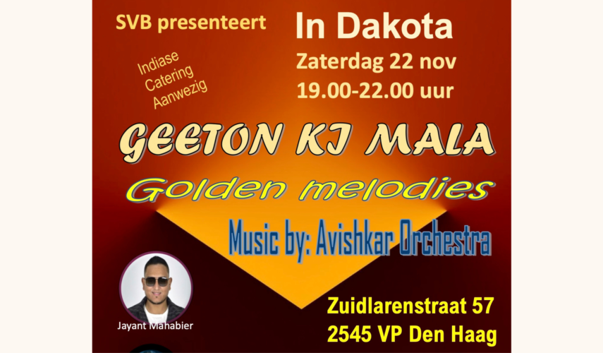 Laat je meevoeren op een muzikale reis vol tijdloze Bollywood-klassiekers. Ervaar de warmte, emotie en energie van de gouden melodieën uit vervlogen tijden. Met prachtige zang van Bhavika Adapa, Moumita Biswas, Vijay Jitan, Jayant Mahabier, en Venkat Adapa, begeleid door het veelzijdige Avishkar Orchestra. Een avond vol muziek, herinneringen en magie – MIS DIT NIET-!! Trouwens er is ook Indiase catering aanwezig, maak er een feestje van. Zie je zaterdag 22 november.