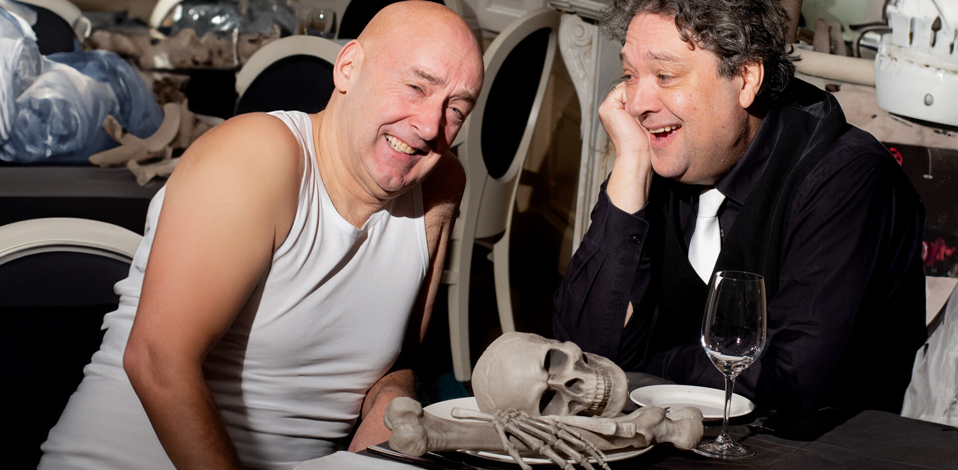 Twee mannen denken dat ze twee willekeurige mannen zijn. (‘Een-spectaculair-spannende-hilarische-who-dunnit-toneel-comedy’)