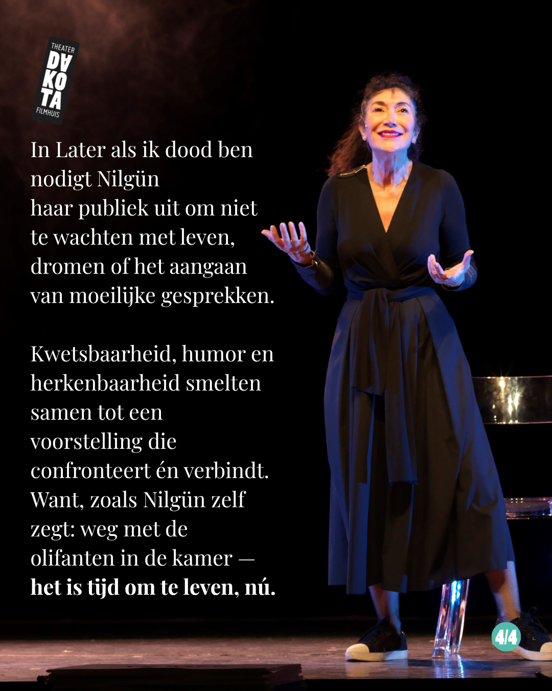 Nilgün Yerli onderzoekt dat alle op volle kracht en met hart & ziel, altijd verbaasd en op zoek naar de lach, want als je het hebt over `Later als ik dood ben' kun je die woorden alleen maar lachend uitspreken.